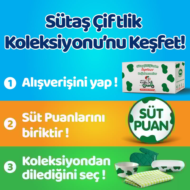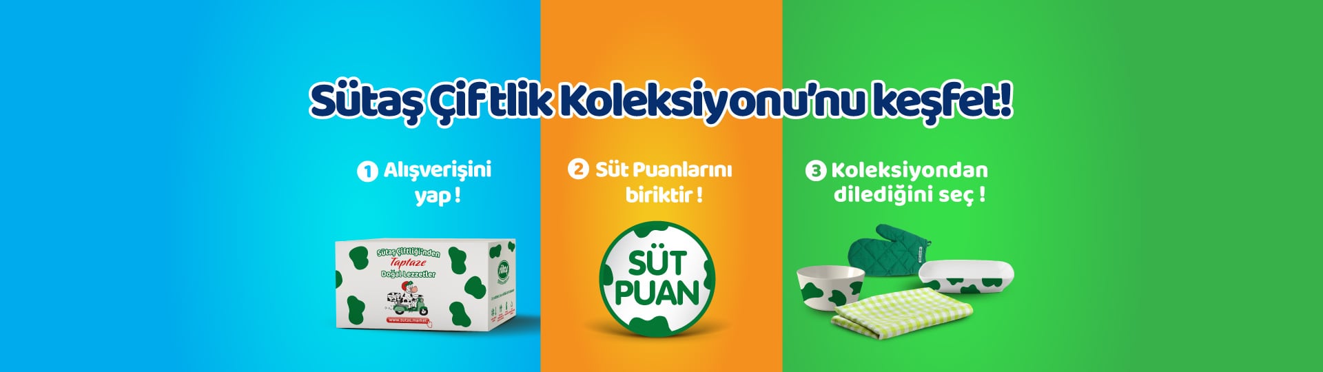 Sütaş Çiftlik Koleksiyonu'ndaki ürünler ve Süt Puanlar Sütaş tarafından değiştirilebilir. Sütaş Çiftlik Koleksiyonu ürünleri stoklarla sınırlıdır.