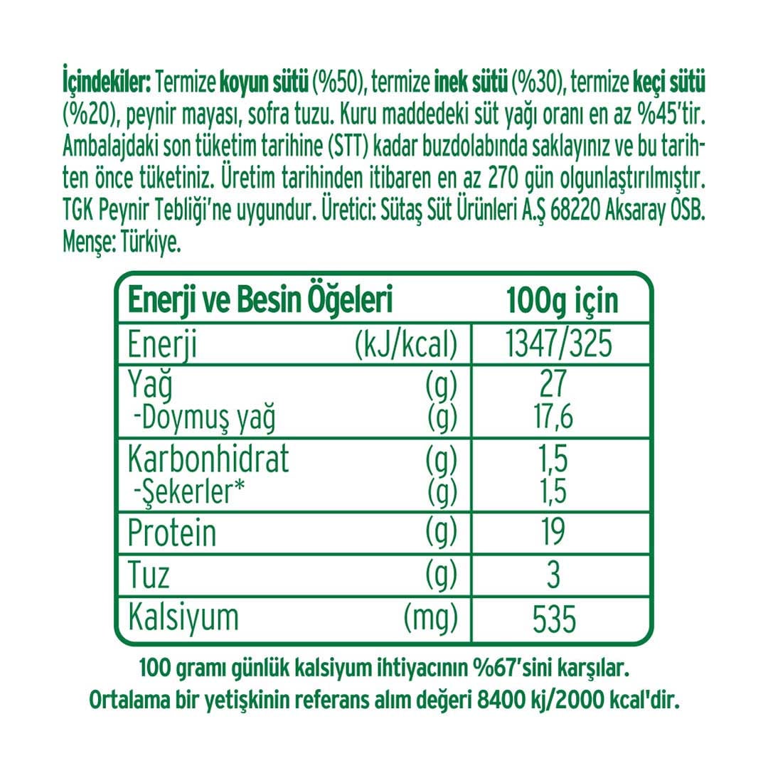 Damak tadına düşkün olanlara Sütaş Klasik Beyaz Peynirler! Sütaş Koyun Beyaz Peyniri yüksek kalitedeki koyun, inek ve keçi sütlerinin lezzetli karışımından üretilen özel bir peynirdir. İdeal lezzet ve yapıya ulaşabilmesi için en az 9 ay boyunca olgunlaştırılır. Geleneksel lezzetleri tercih edenler ve beyaz peynirde özel bir tat arayanların vazgeçemeyeceği bir lezzettir.