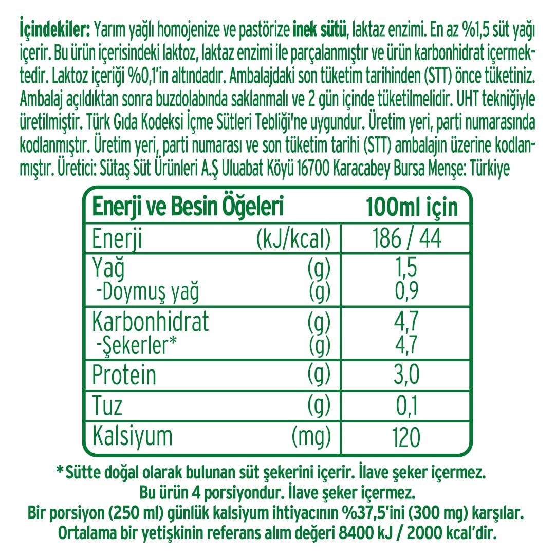 Yarım yağlı homojenize ve pastörize inek sütü, laktaz enzimi. En az %1,5 süt yağı içerir. Bu ürün içerisindeki laktoz , laktaz enzimi ile parçalanmıştır ve ürün karbonhidrat içermektedir. Laktoz içeriği % 0,1 in altındadır.